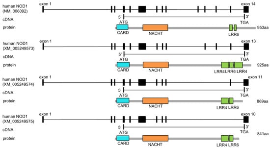 NOD1 and NOD2 are the best-characterized members of NLRC subfamily. Significant advances have been achieved regarding the function of NOD1 and NOD2 in innate immune responses to bacterial, parasite and viral infections [,,,]. Although alternative pre-mRNA splicing was only reported for NOD2 but not NOD1 in mammals and teleost fish, analysis of human databases revealed the existence of multiple splicing variants of NOD1 (Figure 1). Different from mammalian NOD1, only one form of NOD1 exists in zebrafish (D. rerio) since Western blotting exhibits the single band in the lysates from ZF4 cells and wild type zebrafish using monoclonal anti-NOD1 antibody [].