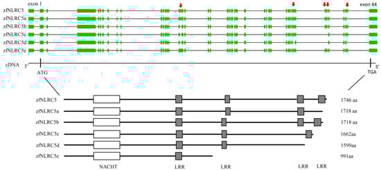 The alternative splicing of zebrafish NLRC5. Exons are indicated as square boxes, and the introns as straight lines. GenBank accession numbers for zebrafish NLRC5 isoforms are: zfNLRC5, AFN73230; zfNLRC5a, AFN73231; zfNLRC5b, AFN73232; zfNLRC5c, AFN73233; zfNLRC5d, AFN73234; zfNLRC5e, AFN73235. NACHT: nucleotide-binding oligomerization domain; LRR: Leucine-rich repeats. The alternatively spliced exons were indicated in the red arrows.