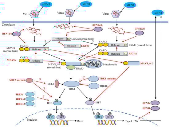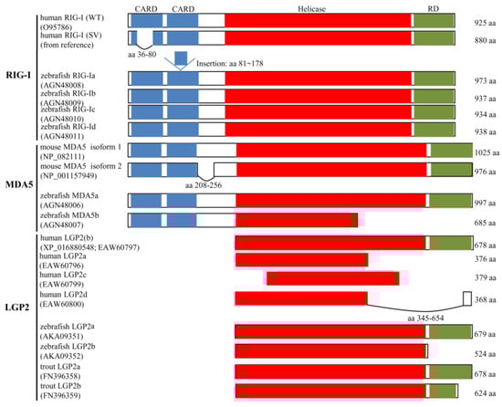In teleost fish, RLRs were first found in 2008 using bioinformatic analysis []. RIG-I, MDA5 and LGP2 genes have been cloned in crucian carp (Carassius auratus) [], common carp (Cyprinus carpio) [], black carp (Mylopharyngodon piceus) [,], grass carp (C. idella) [,,], zebrafish (D. rerio) [,,,], channel catfish (I. punctatus) [], orange spotted grouper (Epinephelus coioides) [,], Atlantic salmon (Salmo salar) [], rainbow trout (O. mykiss) [], large yellow croaker (Larimichthys crocea) [], green chromide (Etroplus suratensis) [], sea perch (Lateolabrax japonicas) [,] and Japanese flounder (P. olivaceus) []. Similar to those orthologs in mammals, piscine RLRs could be spliced at RNA levels, which lead to sequence deletion or insertion in the open reading frame (ORF) (Figure 3).