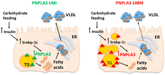 - Huang, Y.; He, S.; Li, J.Z.; Seo, Y.K.; Osborne, T.F.; Cohen, J.C.; Hobbs, H.H. A feed-forward loop amplifies nutritional regulation of PNPLA3. Proc. Natl. Acad. Sci. USA. 2010, 107, 7892–7897. [Google Scholar] [CrossRef] [PubMed]