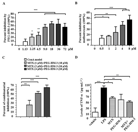 Effect of PEG-HM-3 alone or in combination with Methotrexate (MTX) on lymphoproliferative responses to mitogen ConA and anti-inflammation activity. (A) Inhibited proliferation with PEG-HM-3 (1.13–7.2 μM) in ConA (5 μg·mL−1)-induced splenocytes. (B) Inhibited proliferation with MTX (0.5–8 μM) in ConA (5 μg·mL−1)-induced splenocytes. (C) Dose-dependent inhibited proliferation with MTX in combination with fixed PEG-HM-3 (18 μM) in ConA (5 μg·mL−1)-induced splenocytes. (D) TNF-α levels in LPS (1 μg·mL−1)-induced RAW264.7 macrophage supernatants treated by MTX (1 μM), PEG-HM-3 (18 μM) or their combination. Values are means and standard error of the mean (SD) (n = 3 in (A,B); n = 4 in (C); n = 3 in (D)). The one-way ANOVA was used for group comparison. Versus ConA group or LPS group, * p < 0.05, ** p < 0.01 or *** p < 0.001.