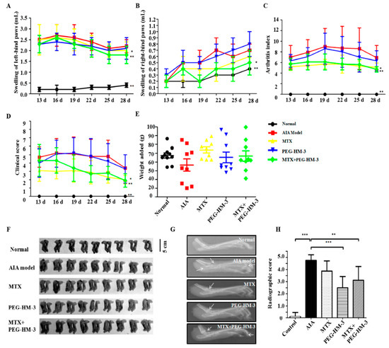 Curative effect of PEG-HM-3 alone or in combination with Methotrexate (MTX) on adjuvant-induced arthritis rats. All parameters were evaluated once every three days from the 13th day to the 28th day after disease onset (day 13, 16, 19, 22, 25, 28). (A) Swelling of the left-hind paws (mL); (B) Swelling of the right-hind paws (mL); (C) Arthritis index; (D) Clinical score; (E) Weight added (g) at the 28th day. MTX (1 mg·kg−1), PEG-HM-3 (10 mg·kg−1) and combination of MTX (1 mg·kg−1) and PEG-HM-3 (10 mg·kg−1) were used. Values are means and standard error of the mean (SD) ((A–E), n = 9 in each group); (F) Morphology of the left- and right-hinds paws in each group; (G) X-ray exhibition of the left-hind paws of rats at the end of the experiment; (H) The radiographic analysis of the left-hind paws (n = 8 in each group). Versus AIA model group. ** p < 0.01; *** p < 0.001.