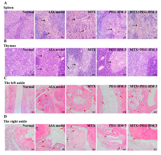 To further investigate the efficacy of combination therapy in vivo, the spleen, thymus, and joint cavity were analyzed at a histological level. As shown in Figure 3A, there was no abnormal tissue in the negative control group (grade 0). Serious symptoms of increased cell proliferation, hyperemia, prominent germinalcenter (GC), and white pulp were seen in the spleens in the AIA model group (grade 3). Compared with the AIA model group, the combination of MTX and PEG-HM-3 resulted in decreased symptoms (grade 1). The pathology was also significantly decreased in the PEG-HM-3 treatment group (grade 1). Cell proliferation, marginal zone, and the appearance of prominent GC and white pulp in the spleen were reduced by MTX (grade 2).