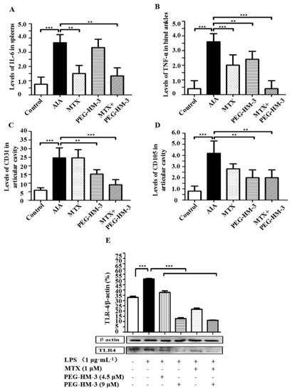 Toll-like receptors (TLRs) are the front line of the immune response. The expression of TLR-4 protein was significantly down-regulated by PEG-HM-3 (9 μM) treatment alone or in combination with MTX (p < 0.001) (Figure 4E). Although the expression of TLR-4 protein was inhibited by MTX treatment, the inhibition between PEG-HM-3 (4.5 μM) and MTX was not significantly different. It is suggested that the activity of TLR-4 protein was down-regulated by PEG-HM-3 treatment through the TLR signaling pathway.
