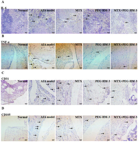 To assess the inhibitory effects on angiogenesis, microvessel density (MVD) was evaluated. The MVD was evaluated by the expression of CD31 in the joint cavity. As shown in Figure 4C and Figure 5C, CD31-positive fields were mainly adjacent to the synovial fibroblasts. It was interesting that small blood vessels were dyed by the CD31-positive antibody, which were surrounded by an annular monolayer of synovial fibroblasts. The lowest expression of CD31 was present in the combination treatment group (9.0 ± 3.0, p < 0.001). PEG-HM-3 treatment alone resulted in a significantly lower expression level than the AIA model group (15.2 ± 2.6, p < 0.01). However, MTX treatment had no effect on the expression of CD31. The CD105 positive cells were mainly distributed in the articular cartilage layer and synovial cells (Figure 4D and Figure 5D). The highest inhibitory effect on the expression of CD105 was achieved by combination treatment (2.0 ± 0.71, p < 0.01) and PEG-HM-3 treatment (2.0 ± 0.71, p < 0.01). However, MTX treatment showed no significant effect on the expression of CD105.