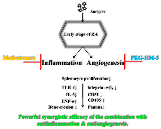 At present, the early phenomenon of inflammatory angiogenesis is rarely studied in Rheumatoid arthritis (RA). Previous research found that PEG-HM-3, an integrin inhibitor, possessed anti-angiogenesis and anti-rheumatic activity. In this study, the advantages of inhibiting angiogenesis and immune cell adhesion and migration, as well as the benefits of anti-arthritis effects, were evaluated using a combination of PEG-HM-3 and methotrexate (MTX). In vitro, spleen cell proliferation and the levels of tumor necrosis factor α (TNF-α) in macrophage supernatant were assessed. Hind paw edema, arthritis index, clinical score, body weight and immunohistochemistry (IHC) of the spleen, thymus, and joint cavity were evaluated in vivo in adjuvant-induced arthritis rats. Joints of the left hind paws were imaged by X-ray. The expression of the toll-like receptor 4 (TLR-4) protein was assessed in lipopolysaccharide (LPS)-induced synoviocytes. PEG-HM-3 combined with MTX significantly reduced primary and secondary swelling of the hind paws, the arthritis index, the clinical score and bone erosion. The results of IHC showed that the levels of interleukin-6 (IL-6) in spleens and the levels of TNF-α, CD31 (cluster of differentiation 31), and CD105 in the joint cavity were decreased. The body weight of rats was maintained during combination therapy. Ankle cavity integrity, and bone erosion and deformity were improved in combination treatment. The expression of TLR-4 was significantly reduced with combination treatment in rat synoviocytes. Co-suppression of both inflammation and angiogenesis in arthritis was achieved in this design with combination therapy. The activity of nuclear transcription factor (NF-κB) and the expression of inflammatory factors were down regulated via integrin αvβ3 and TLR-4 signaling pathways. In the future, the application of this combination can be a candidate in early and mid-term RA therapy.