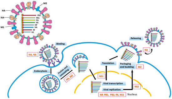 The influenza hemagglutinin (HA) is a type I integral membrane protein. Its ectodomain consists of the outward globular HA1 domain and the HA2 stem domain, through which the ectodomain is associated with the membrane-spanning region which anchors the whole protein to the virus membrane. Based on the variability of HA, influenza A viruses are classified into 18 HA (H1-H18) subtypes [21]. The influenza virus life cycle is initiated by the recognition of sialic acid (SA) of the host cell glycoprotein by HA, followed by endocytosis. Fusion of the viral and endosomal membrane requires an acidic pH-triggered HA conformational change (Figure 1).