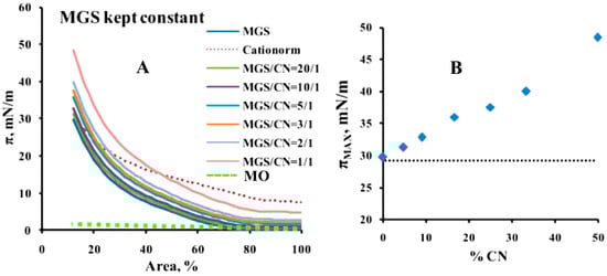 (A) Surface pressure area isotherms of MGS/CN pseudobinary films obtained at fixed MGS amount (i.e., the inclusion of CN increased the total lipid amount at the interface). The green dashed line shows the lack of surface activity by 30 µg of mineral oil (MO) mixture, consisting of light and heavy mineral oil in 1/1 ratio; (B) Dependence (blue rhombs) of maximum surface pressure, πMAX, on CN content at fixed MGS amount (the dashed line shows the lack of effect of MO on πMAX).