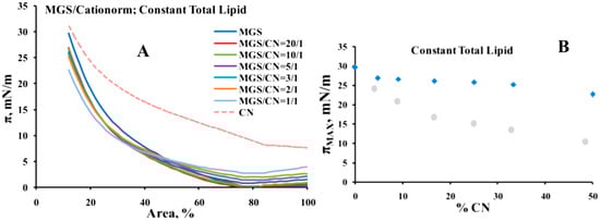 When the amount of MGS was fixed, the inclusion of CN shifted the isotherms to higher surface pressures for the entire range of film areas (Figure 1A). It can be seen that the maximum surface pressure, πMAX, achieved at maximum degree of compression (i.e., at minimum film area) increased proportionally to the CN content, from 30 mN/m (pure MGS) to 48 mN/m (at MGS/CN = 1/1). The effect was significant (p < 0.01) along the entire range of compositions studied as revealed by statistical analysis (one way ANOVA with Tukey-Kramer post-hoc comparisons). In contrast control experiments with pure oil phase (dashed line in Figure 1A), showed that MO had very limited surfactant potency (reaching around 3 mN/m at compression) and showed no impact on πMAX. (dashed line at Figure 1B). Therefore it can be concluded that CKC and the surface active species in the aqueous phase of CN contributed to the surface activity of the cationic nanoemulsion (Figure 1B).
