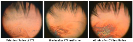 Specular microscopy images of tear film lipid layer prior and after instillation of CN at the ocular surface. (Field of view is approximately 3 cm2).
