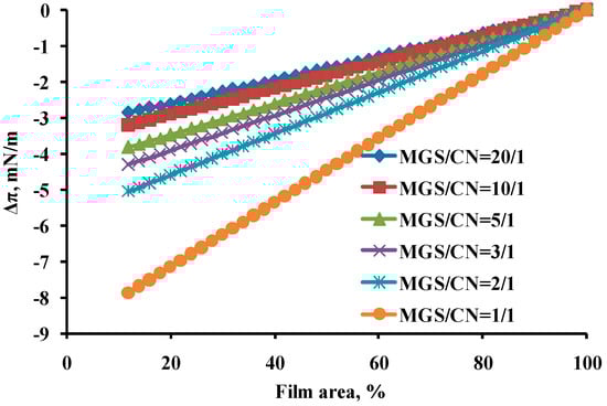 It can be seen that CN and MGS displayed aggregation interaction, characterized with negative sign of theΔπ, with the term absolute value increasing (i) in the course of compression and (ii) with the CN content. For most of the tested mixtures (MGS/CN ≤ 2/1) |Δπ| ≤ 5. Only at very high CN content, MGS/CN = 1/1, Δπ reached as negative value as −8.
