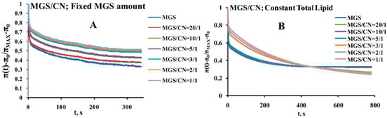 When experiments were performed at fixed MGS amount, the increase in the inclusion of CN shifted the relaxations to higher surface pressures (Figure 6A). As shown by the Fourier transformation analysis this corresponds to increased contribution of the real (elastic) part of the complex modulus to the viscoelasticity of the pseudobinary films (Figure 7A and Supplementary Material).