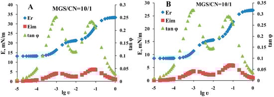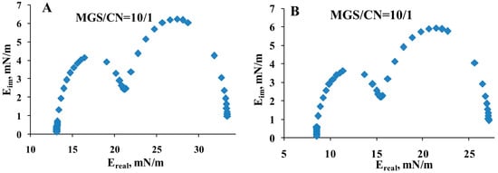 It can be clearly seen that two peaks were observed in the Cole–Cole plots, at ER of 17 and 28 mN/m at fixed MGS amount (Figure 8A) and at ER of 12.5 and 23 mN/m at fixed total lipid (Figure 8B).