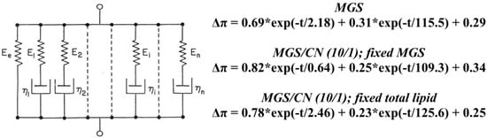 In the framework of the generalized Maxwell model the equation represents rheological system of parallel elements in which each exponential term corresponds to a Maxwell spring-and-dashpot element and ΔπEQ to a spring element denoting the equilibrium elasticity [,,,]. The relaxation time of each Maxwell element is defined as the ratio between its viscosity and elastic modulus (τi = ηi/Ei). The output of applying Equation (2) is summarized at Figure 9.