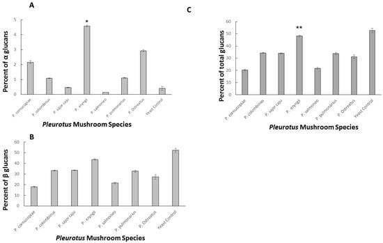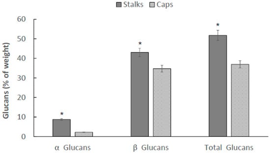 2.3. Total, α-Glucan, and β-Glucan Distribution in P. eryngii between Caps (C) and Stalks (S)