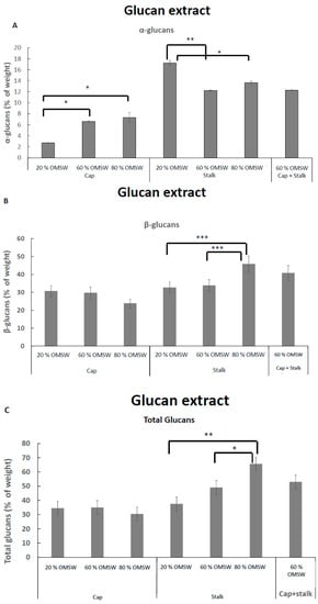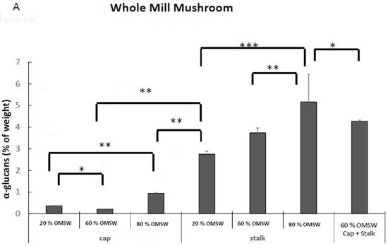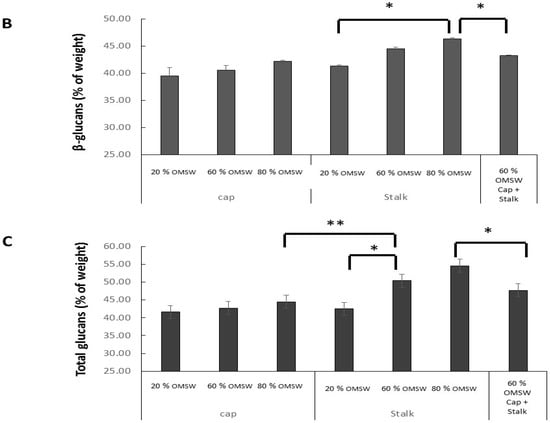 2.4. The Effect of Cultivation of Pleurotus Eryngii in Various Relative Amounts of Eucalyptus Sawdust and Olive Mill Solid Waste (OMSW) on Concentrations of Total Glucans, α-Glucans, and β-Glucans