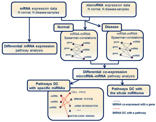 Pathway analysis was performed as shown in Figure 1. We searched for differentially expressed mRNA pathways and for differentially co-expressed (DC) pathways (i.e., pathways characterized by significant changes in miRNA–mRNA interactions).