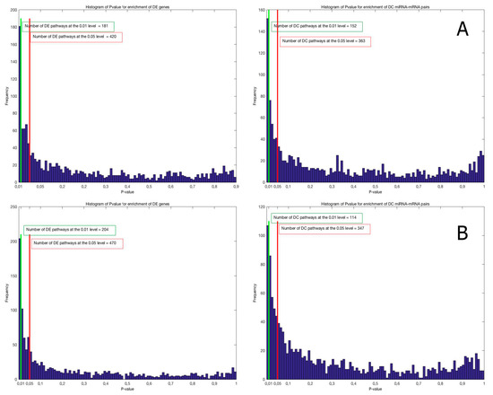 DC and DE enrichment pathway analyses were performed on the C5 and C2Cp collections from the MSigDB database (http://software.broadinstitute.org/gsea/msigdb) version 5.0, and they include, respectively, 1454 lists of genes sharing a specific Gene Ontology (GO) term (Figure 2A) and 1330 gene sets belonging to canonical pathways from KEGG, BioCarta and Reactome (Figure 2B). The histograms in both Figure 2A,B show that there are significant differences in gene expression and miRNA–mRNA co-expression between IBD inflamed and not-inflamed tissues for the gene sets in the two analyzed collections. In each comparison, the number of significant gene sets at the 0.01 level is greater than the number expected by chance in the case of no significant change between the two conditions that is 15 and 13 for the GO terms and the canonical pathways, respectively.