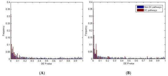 (A) Histogram of differentially expressed (DE) and differentially co-expressed (DC) enrichment p-values for the Gene Ontology term; (B) Histogram of differentially expressed (DE) and differentially co-expressed (DC) enrichment p-values for the canonical pathways.