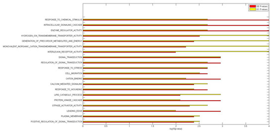Histogram of the differentially expressed (DE) and differentially co-expressed (DC) −log10 p-value plots for the top 20 DC and DE GO terms.