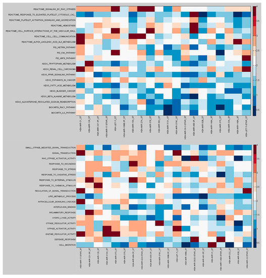 In addition, by hypothesizing that miRNAs that were DC with differentially expressed pathways were miRNAs with regulatory activity on the whole pathway, we ordered the miRNAs for the number of DE pathways linked to them for differential co-expression. (Table 2 and Table S6). While, the list of the pathways differentially co-expressed with the top ranked miRNAs (p < 0.01) were shown in Table S7 (Canonical pathways) and in Table S8 (GO terms).