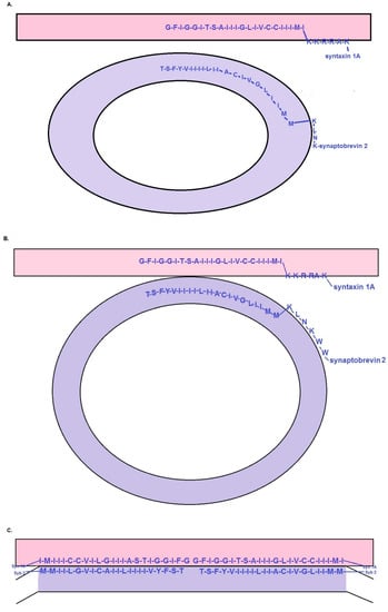 - Bowen, M.; Brunger, A.T. Conformation of the synaptobrevin transmembrane domain. Proc. Natl. Acad. Sci. USA 2006, 103, 8378–8383. [Google Scholar] [CrossRef] [PubMed]