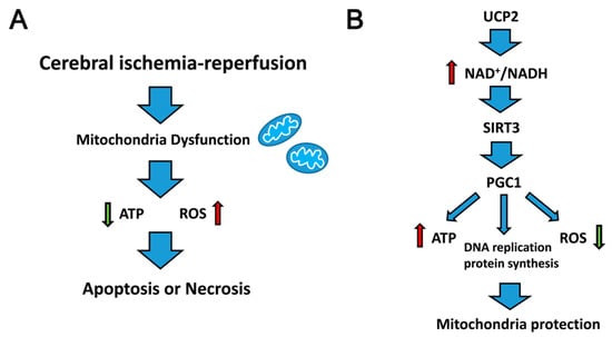 The mitochondrion is the center of energy metabolism and many cellular events. Numerous studies have shown that timely and effective mitochondrial protection is a useful strategy in cerebral ischemia therapy. Herein, we suggest that UCP2 can improve the NAD+/NADH ratio, which activates the SIRT3 downstream target signaling molecule, PGC1α, to maintain mitochondrial biosynthesis and reduce damage caused by oxidative stress during cerebral ischemia–reperfusion injury (Figure 1B). However, there is still no clinical evidence that the brain protection mechanism of SIRT3 is mediated by UCP2. Thus, further research is needed to explain this potential pathway in cerebral ischemia–reperfusion injury.
