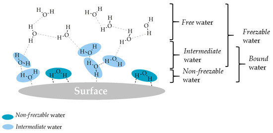 In this review, we refer to the different types of water as: non-freezable water, intermediate water and free water, according to the freezing temperature criterion. Non-freezable and intermediate water are bound water, while intermediate and free water are freezable water (Figure 2). In terms of structure and interaction with surfaces, the three water types are characterized by the following [17,21]: