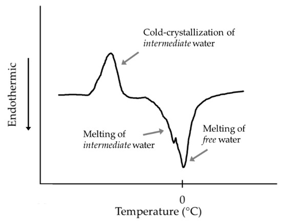 DSC allows the observation of the phase transitions in a thermogram from which various information can be extracted: (i) changes in heat capacity, (ii) magnitude of the heat (exothermic or endothermic), (iii) shape of the exotherms or endotherms, and (iv) the temperature at which these phenomena occur [15]. Figure 3 shows a DSC thermogram of a hydrated surface containing the three types of water: non-freezable, intermediate, and free water. The exothermic peak below 0 °C corresponds to the cold-crystallization of water and indicates the presence of intermediate water. The endothermic peak at around 0 °C corresponds to the melting of free water and intermediate water where it corresponds.