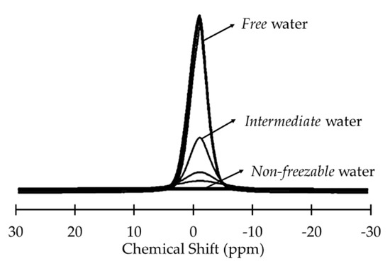 NMR is used to measure the dynamic behavior of water, in contrast to the static state of water tmeasured by DSC. Most of the early investigations on water states used NMR for their identification, as in the case of Hechter and collaborators [13] with agar gels. It can also be used for other materials such as muscle tissue [29] and food, including vegetables [24], fruits [25], and dough [30].