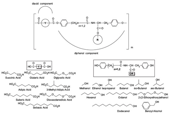 - Kohn, J.; Darr, A.; Schut, J. Polymers Derived from L-Tyrosine. In An Introduction to Biomaterials; Hollinger, J.O., Ed.; CRC Press: Boca Raton, FL, USA, 2011; pp. 309–315. [Google Scholar]