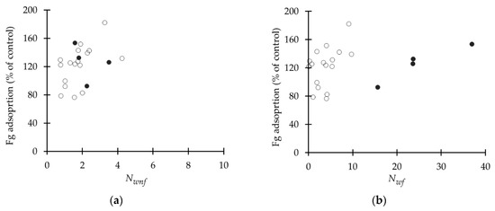 Fibrinogen adsorption data was obtained from Weber and collaborators [44] (Table 2). Figure 7 shows the relation between and fibrinogen adsorption of non-freezable and freezable water. In the case of non-freezable water, there is no apparent relationship between the fibrinogen adsorbed to the surface, but for the low group there is a tendency to increase as the amount of water is increased. On the other hand, when only freezable water is analyzed, the low group has the same tendency as the previous case, although the correlation is lower in the latter. Although only four data points are available, the high WC group shows a direct relation between WC and fibrinogen adsorption. More experiments are required to make a conclusive statement about this relationship.
