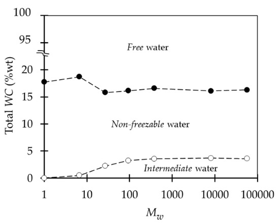 The thermal behavior of aqueous PEG solutions with different Mw was obtained with DSC measurements by Antonsen and Hoffman [48]. They explored and analyzed the effect of the Mw on the amount of bound water and the low-temperature behavior of these solutions. They hypothesized that low Mw PEG chains are only associated with non-freezable water and as the Mw increases, the polymer chains fold upon themselves allowing intermediate water molecules to form. These results agree with the observations made by Yamauchi and Tamai [55] where at Mw lower than 500, intermediate water was not detected, and then slowly increased with the Mw until a constant amount of about 4% of total water was reached at around Mw 2200 (Figure 9).