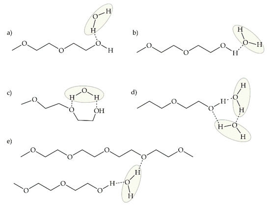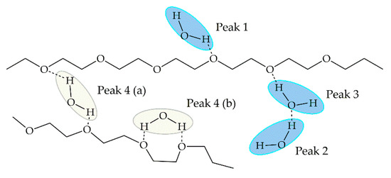 Kitano and collaborators [56] conducted a FT-IR study to analyze the O-H stretching band peaks for sorbed water to PEG films of various Mw and elucidate the effect of OH end groups of the polymer on the interaction with water molecules. In the IR spectra obtained (Figure 3 in [56]), different peaks of the O-H stretching band were observed, from which they proposed five types of sorbed water molecules: binding water, monomeric water binding to the ether oxygen atom of the polymer (peak 1); dimeric water, a water molecule which is hydrogen-bonded to another water molecule binding to PEG (peak 2) or a water molecule hydrogen-bonded to both a water molecule and the ether oxygen of PEG (peak 3); bridging water, association with two ether oxygen atoms (peak 4); and, hydrogen-bonded water to the end OH group (peak X). The latter was only observed in PEG films of low viscosity average molecular weight (Mν ≤ 28 K) due to the increase of OH ends of the polymer. Observing the proposed hydration structure of each water types (Figure 10 and Figure 11) and comparing to the three types of water, the following analogy can be drawn: peak 4 or bridging water corresponds to non-freezable water, while peaks 2 and 3 (dimeric water) correspond to intermediate water. Peak 1, although very similar to bulk water in the IR spectra, also corresponds to intermediate water given the higher mobility than bridging water. In the case of peak X, its IR spectra is very similar to peak 4, meaning water molecules are tightly bound to the polymer chain.
