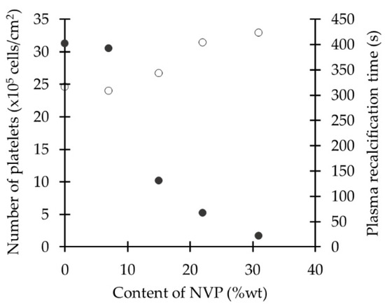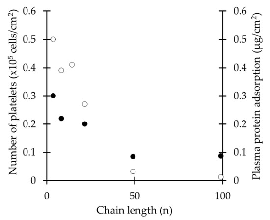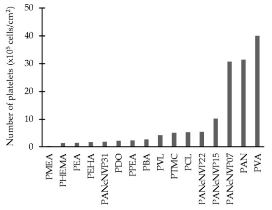 In this review, hemocompatibility is evaluated by the adsorption of plasma proteins and platelet adhesion. It is known that when an implant makes contact with blood, plasma proteins adsorb to the surface. Fibrinogen (Fg), albumin, and immunoglobulins are the most abundant, and along with fibronectin, vitronectin and the von Willebrand factor, these proteins are mediators of the platelet adhesion and thrombosis around the biomaterial [12]. In particular, fibrinogen, the main protein in blood plasma, is fundamental in blood coagulation and thrombosis induced by biomaterials. Activation of fibrinogen leads to platelet immobilization, activation, and aggregation, although the availability of platelet-binding sites is more important than the total amount of adsorbed fibrinogen in mediating platelet adhesion [12]. Either way, high fibrinogen adsorption and high platelet adhesion imply that the biomaterial is not inert in blood, hence it has low hemocompatibility.