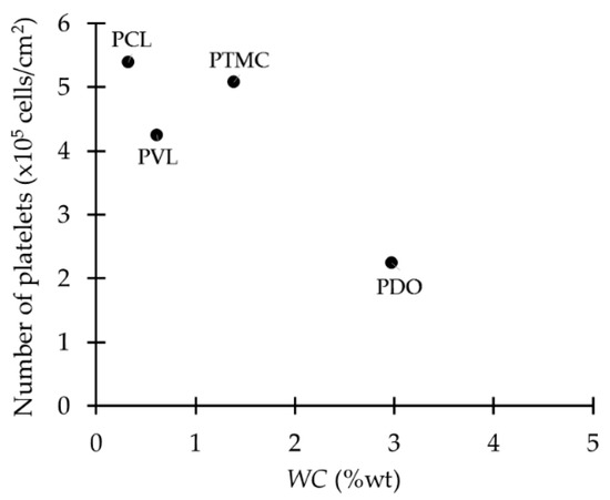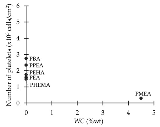In this section, we analyze and discuss the impact of water states on the hemocompatibility, namely protein adsorption and/or platelet adhesion, of different polymers used for medical applications. In the first subsection, we include degradable polymers such as l-tyrosine derived polyarylates, poly(ethylene glycol) (PEG), a group of aliphatic carbonyls, and poly(lactic-co-glycolic acid) (PLGA). In the second subsection, some non-degradable polymers are analyzed, such as poly(meth)acrylates and poly(vinyl alcohol)s.