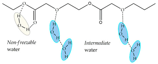 In particular, on hydrated polymers, different water “types” or “states” have been observed. These can be classified depending on the mobility of the water sorbed to the polymeric surface or its freezing temperature. Generally, there are three states of water, one with very low mobility and no freezing (even at −100 °C); one with slightly higher mobility and freezing temperature below 0 °C; and one with similar mobility and freezing temperature as bulk water. Further details about their characteristics and multiple denominations are given in the next section.
