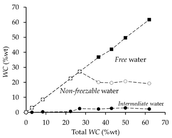 where , and correspond to the percentages of non-freezable, intermediate, and free water, respectively.
