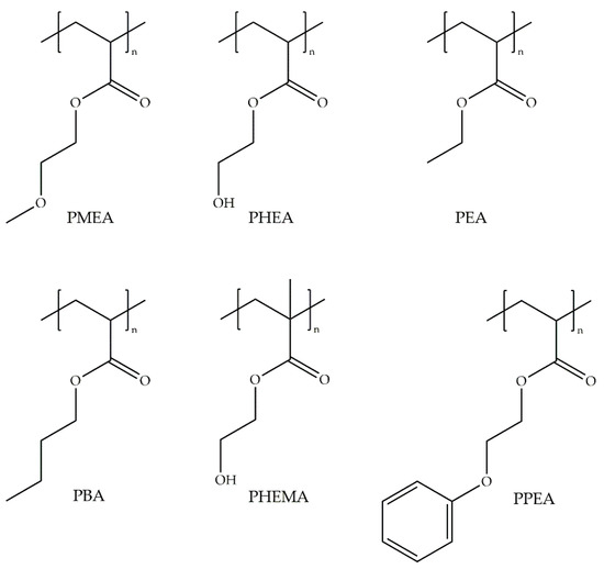 - Miwa, Y.; Ishida, H.; Tanaka, M.; Mochizuki, A. 2H-NMR and 13C-NMR study of the hydration behavior of poly(2-methoxyethyl acrylate), poly(2-hydroxyethyl methacrylate) and poly(tetrahydrofurfuryl acrylate) in relation to their blood compatibility as biomaterials. J. Biomater. Sci. Polym. Ed. 2010, 21, 1911–1924. [Google Scholar] [CrossRef] [PubMed]