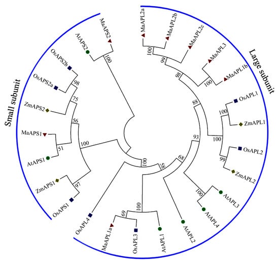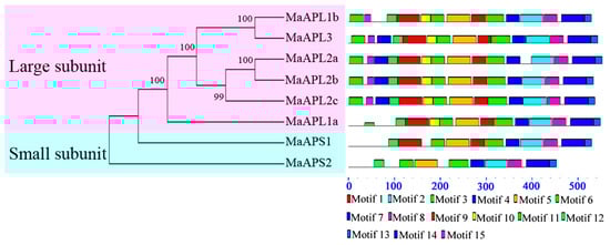 Phylogenetic and motif analyses of MaAGPase proteins. All proteins were identified by MEME database with the complete amino acid sequences of each MaAGPase identified. MaAGPases were classified into large and small subunits based on their phylogenetic relationship.