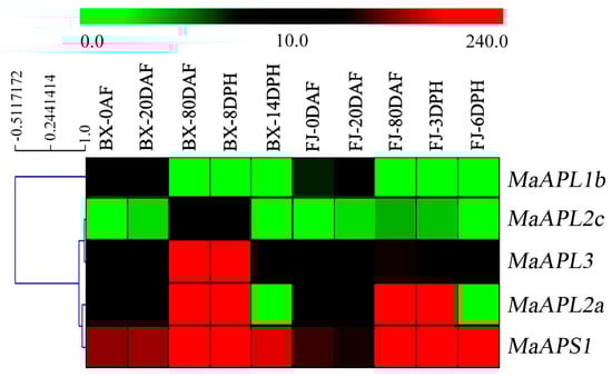In FJ, five, four, and five MaAGPases were expressed in roots, leaves, and fruit, respectively. MaAPS1 was highly expressed in all the tissues examined (FRKM > 10). High expression levels of MaAPL-2a and -3 were also detected in fruits.