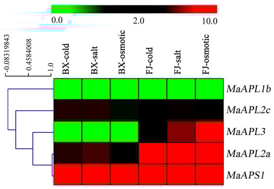 Expression of MaAGPases in response to cold, salt, and osmotic stresses in two banana varieties, BX and FJ. The heat map with clustering was created based on the FPKM value of the MaAGPases. Differences in gene expression are shown in color in the green-red scale.