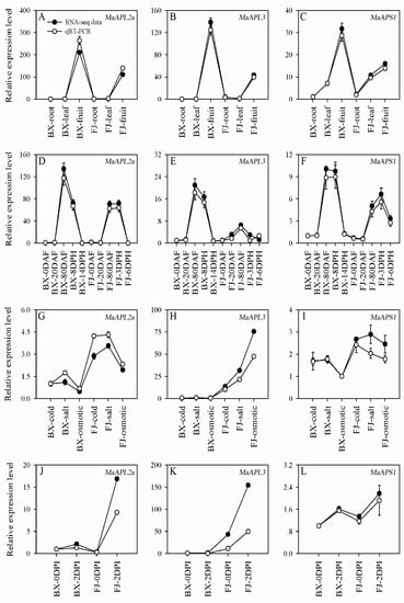 RNA-seq analysis indicated that MaAPL-2a, -3, and MaAPS1 had exhibited high levels of expression in different tissues, or during most stages of fruit development and ripening, or being induced by abiotic/biotic stress treatments in BX or FJ. Such a feature of these three genes was verified by qRT-PCR analysis. After normalization, all the examined MaAGPases with the exception of MaAPL3 in FJ at 6DPH and MaAPS1 in BX at 8DPH showed consistent expression patterns with the RNA-seq analysis (Figure 8). The correlation coefficient between RNA-seq and qRT-PCR data ranged from 0.8750 to 0.9999 (Table S7). These results indicate that RNA-seq analysis supplied suitable expression results for both banana varieties.