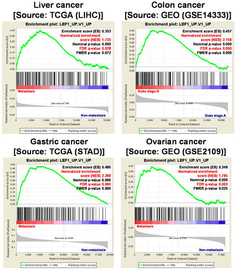 Enrichment of Wnt target genes in multiple metastatic cancer types. A group of genes that are induced by β-catenin/LEF1/TCF4 complex were identified through performed gene set enrichment analysis (GSEA). Microarray data of four different cancer, liver (LIHC), colon (GSE14333), gastric (STAD) and ovarian cancer (GSE2109), were analyzed. Genes upregulated by LEF1 were significantly enriched in metastatic cancers. The detailed methods are described in Supplementary Materials. TCGA; The Cancer Genome Atlas, LEF1; lymphoid enhancer-binding factor 1, GEO; Gene Expression Omnibus.