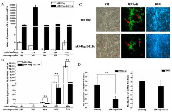 Ji, L.; Zhou, X.; Liang, W.; Liu, J.; Liu, B. Porcine Interferon Stimulated Gene 12a Restricts Porcine Reproductive and Respiratory Syndrome Virus Replication in MARC-145 Cells. Int. J. Mol. Sci. 2017, 18, 1613. https://doi.org/10.3390/ijms18081613