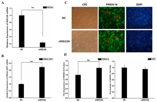 2.5. Knockdown of Endogenous ISG12A Enhanced PRRSV Replication in MARC-145 Cells