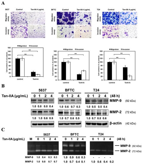 Tan-IIA inhibited migratory and invasive ability in human BCa cells. (A) Human BCa cells were treated with 0.2% DMSO as a vehicle control or 4 μg/mL Tan-IIA for 24 h and then seeded onto the transwell hanging insert for migration (24 h) and invasion (48 h) assays. Images were captured using an inverted microscope with 200× magnification; Scale bar: 50 μm. The migration and invasion of BCa cells were quantified by counting the stained cells that migrated into the underside of the hanging insert membrane; (B) human BCa cells were treated with different concentrations of Tan-IIA (1, 2 and 4 μg/mL) for 48 h. The protein of total cell lysates were then used to detect MMP-9/-2 protein expression using western blot, and the (C) supernatant was used to detect the enzymatic activity using zymography analysis. M: marker. Data are presented as means ± S.D. from three different experiments. ** p < 0.01 versus vehicle.