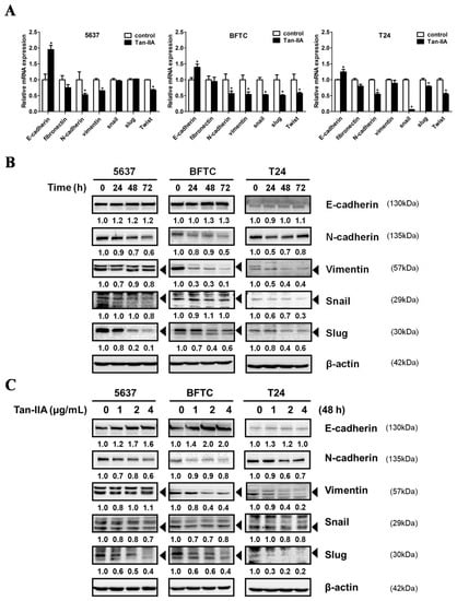 EMT is a crucial step for the invasion and metastasis of BCa cells. We first show that Tan-IIA could inhibit cellular migration and invasion in BCa cells, and this is accompanied by the up-regulation of epithelial marker E-cadherin, the down-regulation of mesenchymal markers N-cadherin and Vimentin, and the down-regulation of transcription factor Snail and Slug, at both the mRNA and protein level as evidenced by quantitative RT-PCR (qRT-PCR) (Figure 2A) and western blot (Figure 2B,C).