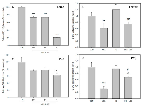 Melatonin reduces glucose uptake in prostate cancer cells. Labeled 2-deoxy-d-[1-3H]glucose uptake was performed in LNCaP cells (A); and PC-3 cells (C) after 10 min of incubation in the presence of increasing concentrations of melatonin. 2-deoxy-d-glucose (2-DG) uptake was performed in: LNCaP (B); and PC-3 cells (D) grown in media supplemented with 2 g/L glucose (CON) or 4 g/L glucose (HG) with or without 1 mM melatonin (MEL) for 24 h. Arbitrary 1.0 was given to CON groups. A representative of three independent experiments is shown. Results are represented as mean ± SEM (n = 3). * p < 0.05 vs. CON, ** p < 0.01 vs. CON, *** p < 0.001 vs. CON, # p < 0.05 vs. HG, ## p < 0.01 vs. HG.