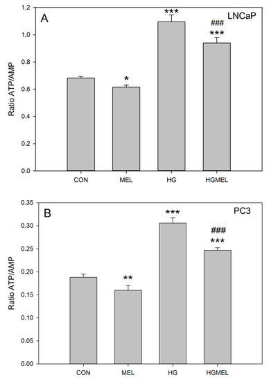 Melatonin decreases ATP/AMP balance in prostate cancer cells. ATP and AMP were measured by HPLC in: LNCaP (A); and PC-3 cells (B) grown in media supplemented with 2 g/L glucose (CON) or 4 g/L glucose (HG) with or without 1 mM melatonin (MEL) for 24 h. A representative experiment of three is shown. Results are represented as mean ± SEM (n = 3). * p < 0.05 vs. CON, ** p < 0.01 vs. CON, *** p < 0.001 vs. CON, ### p < 0.001 vs. HG.
